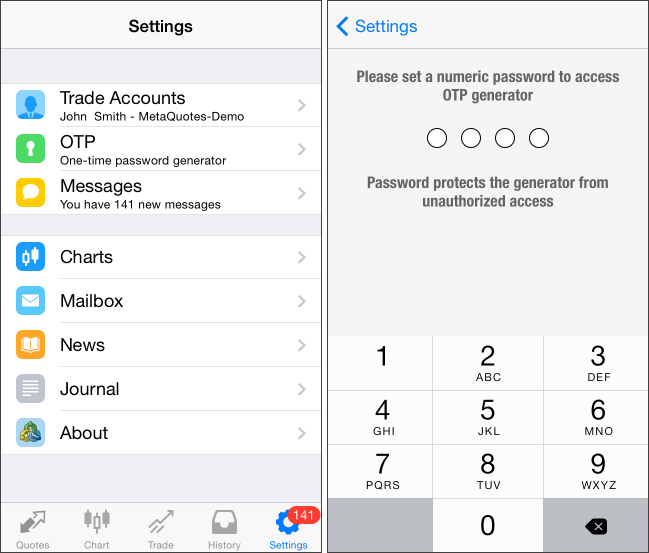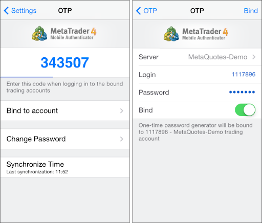 Um die Zwei-Faktor-Authentifizierung (2FA) zu verwenden, müssen Sie zunächst das Einmal-Passwort (OTP) aktivieren und Ihr Tradingkonto mit dem Passwort-Generator verbinden, den Sie in den mobilen MT4/MT5-Apps für iPhone und Android finden.